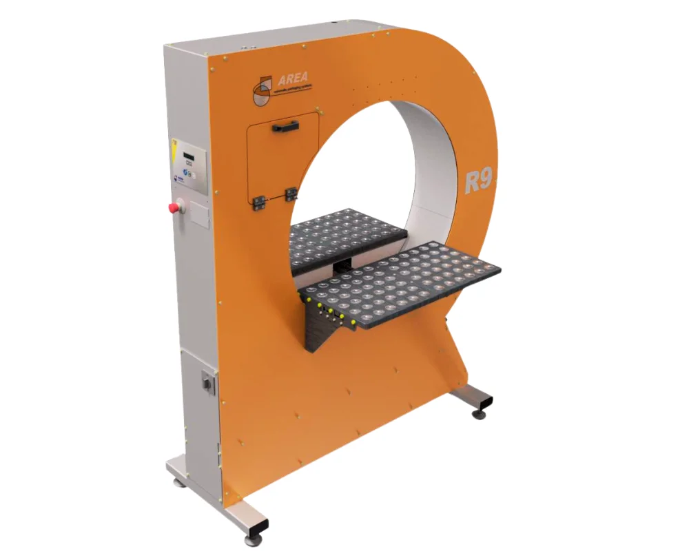 Półautomatyczna owijarka do owijania opon samochodowych, pojedynczej lub do czterech nałożonych na siebie. W komplecie ze stołem kulkowym umożliwiającym łatwe obracanie opakowania – obsługiwana (start-stop) za pomocą pedału nożnego, automatyczne zaciskanie i ucinanie folii i ręczny obrót produktu.