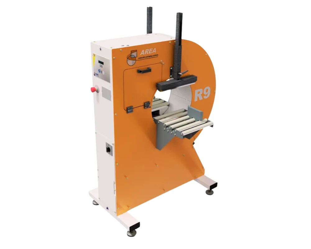 R9 to półautomatyczna owijarka pozioma z pedałem nożnym, do poziomego owijania folią stretch towarów/wiązek o praktycznie nieograniczonej długości. Sposób owijania zależy od potrzeb operatora owijarki. Nadaje się do zadań o średniej wydajności produkcyjnej. Seria maszyn R9 występuje w pięciu szerokościach pierścienia: 40,60,100,140 lub 200 cm.